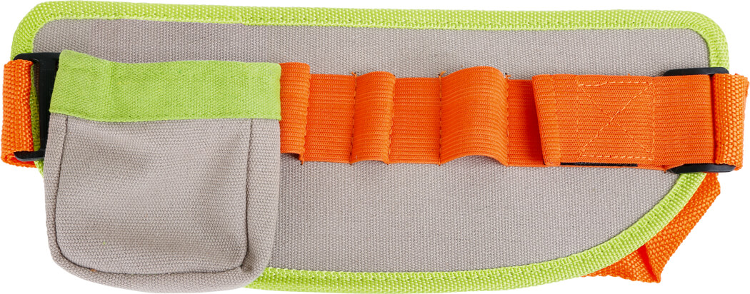 Με αυτήν την πολύχρωμη ζώνη εργαλείων οι μικροί τεχνίτες προετοιμάζονται καλύτερα. Περιλαμβάνει χάρακα, κατσαβίδι, σφυρί, κλειδί, τρεις βίδες και πέντε παξιμάδια από μασίφ ξύλο με πολύχρωμη λάκα. Η ρυθμιζόμενη ζώνη μπορεί να έχει μήκος μεταξύ 41 και 103 cm. Διάσταση: 30 x 12 x 2.5