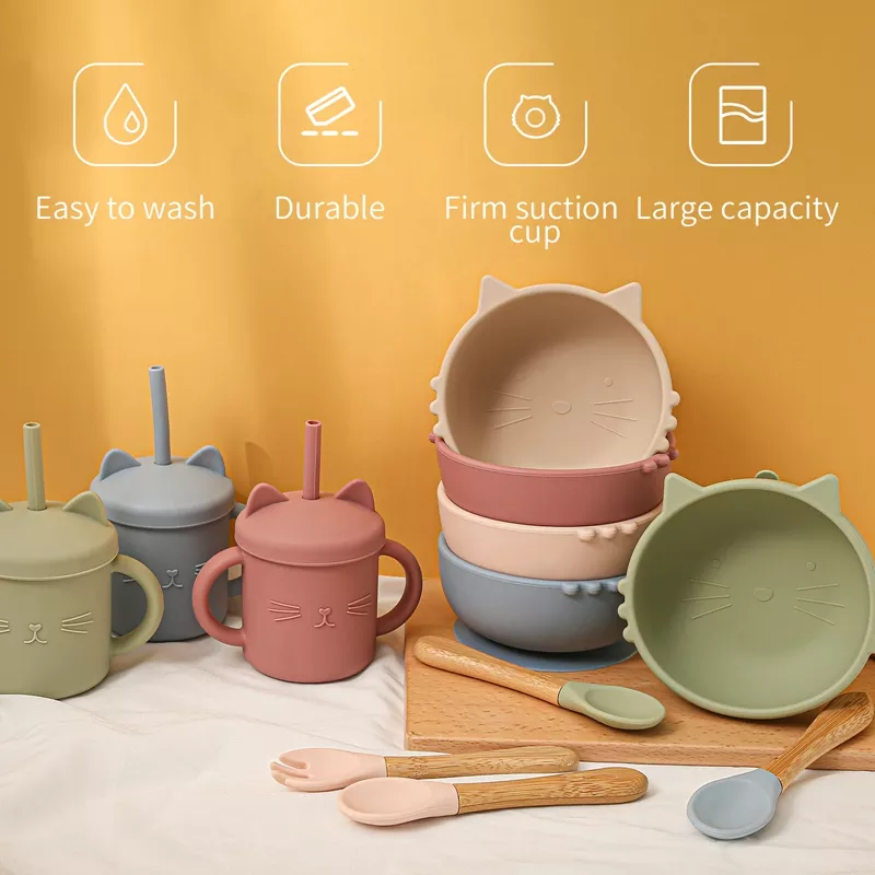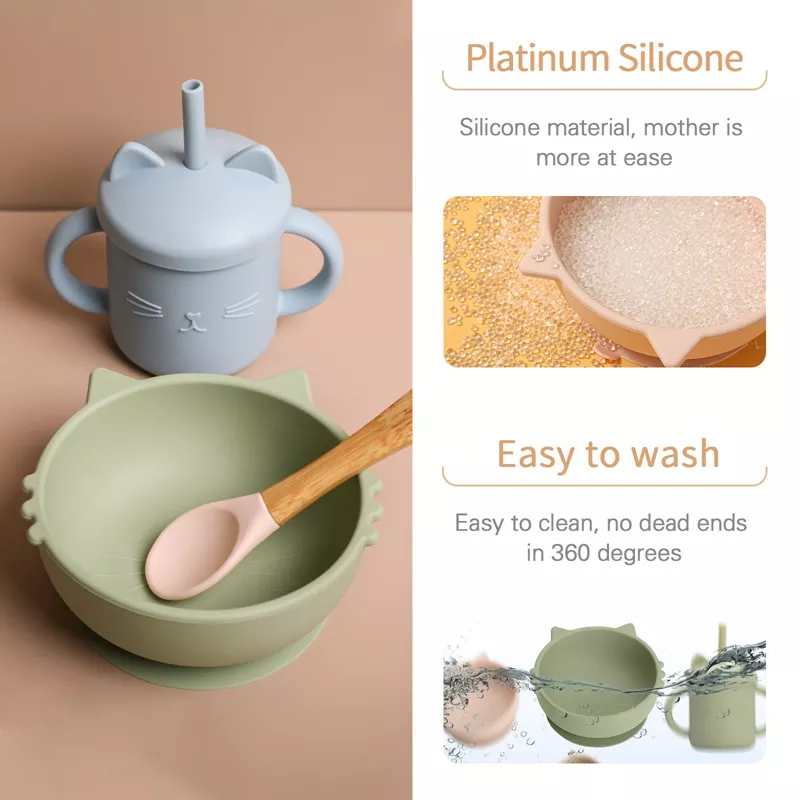 Το μπολ έχει βεντούζα ώστε να προσφέρει σταθερότητα και να μην μπορεί να το αναποδογυρίσει το παιδάκι. Το κουταλάκι είναι από bamboo και σιλικόνη. Το εκπαιδευτικό ποτηράκι έχει καλαμάκι και λαβές για να το πιάνει εύκολα το παιδάκι.