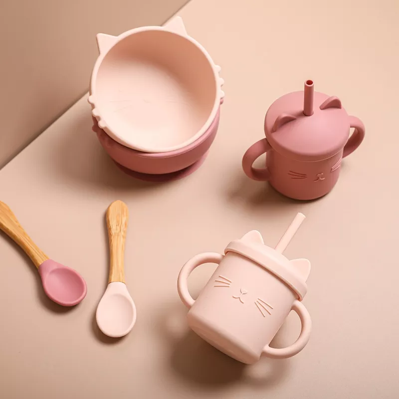 Ένα σετ φαγητού σιλικόνης που αποτελείται από μπολ, κουταλάκι & εκπαιδευτικό ποτηράκι σε ροζ απόχρωση!