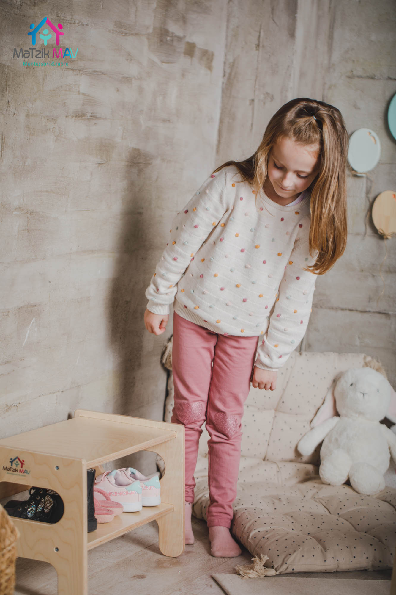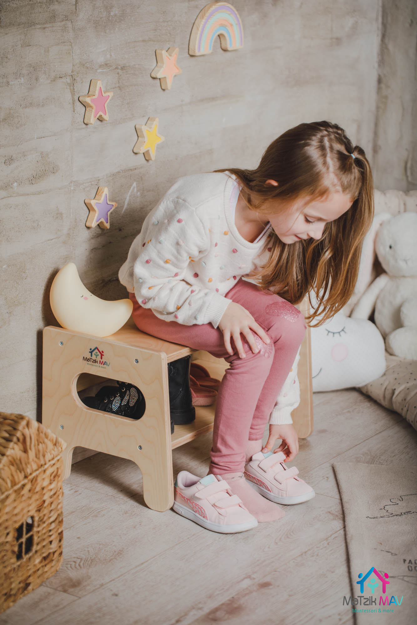 Η Παπουτσοθήκη-Σκαμπό είναι το ιδανικό μέρος για να καθίσει ένα παιδάκι και να βάλει μόνο του τα παπουτσάκια. Μπορεί να τοποθετηθεί κοντά στην εξώπορτα του σπιτιού ώστε να τους βοηθήσει στην καθημερινή συνήθεια του να βάζουν μόνα τους τα παπούτσια! Ο αποθηκευτικός χώρος κάνει τα παιδιά να μπορούν να απολαύσουν την ανεξαρτησία του να διαλέγουν μόνα τους τι θα φορέσουν! Εκτός από αυτή την χρήση της μπορεί να χρησιμοποιηθεί και σαν σκαμπό σε οποιοδήποτε χώρο του σπιτιού (παιδικό δωμάτιο, σαλόνι), τοποθετώντας στο κάτω επίπεδο παιχνίδια, περιοδικά, παραμύθια κι ότι άλλο επιθυμείτε!