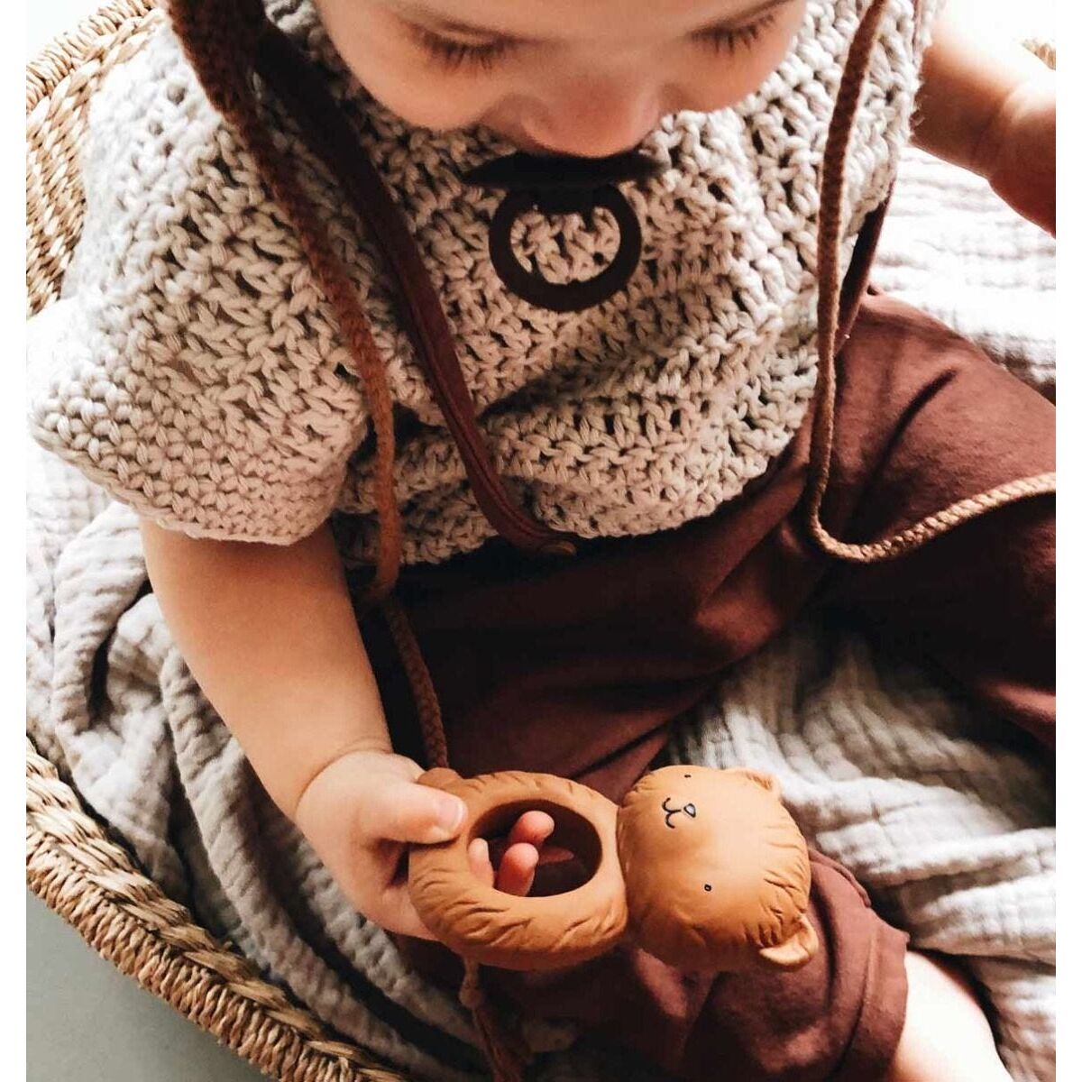 Είναι κατασκευασμένο από 100% φυσικό καουτσούκ Hevea, έχει μια ελαφριά μυρωδιά και δεν περιέχει επιβλαβή υλικά. Είναι ασφαλές και άνετο για την οδοντοφυία του μωρού σας και χάρη στο σχήμα του μπορεί εύκολα να το κρατήσει με τα μικρά του χεράκια.