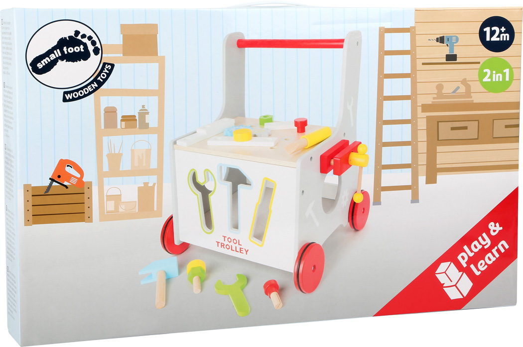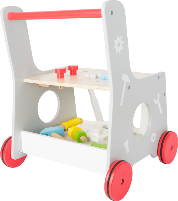 Εκτός από το να μάθουν να περπατούν τα παιδιά μπορούν επίσης να εξασκήσουν τις πρώτες μηχανικές εργασίες τους με τις πολλές διαφορετικές ευκαιρίες παιχνιδιού. Μπορούν να παίξουν με το σφυρί, το κατσαβίδι και το κλειδί χρησιμοποιώντας τις πολλές τρύπες στο επάνω μέρος της περπατούρας. Τα εργαλεία μπορούν να αποθηκευτούν μέσα – ειδικά τοποθετώντας τα στο σωστό άνοιγμα στην μπροστινή πλευρά.