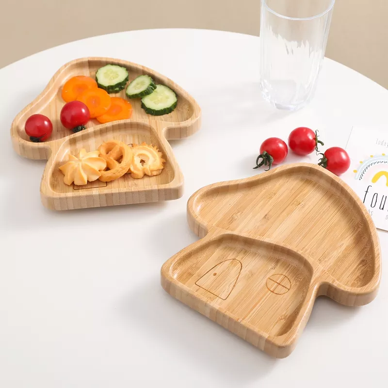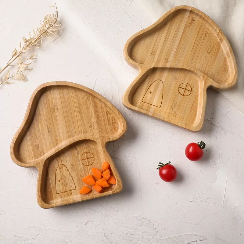 Πιάτο μπαμπού σε σχέδιο μανιτάρι με αποσπώμενη βεντούζα σιλικόνης, κουταλάκι & πιρουνάκι σε βεραμάν χρώμα!