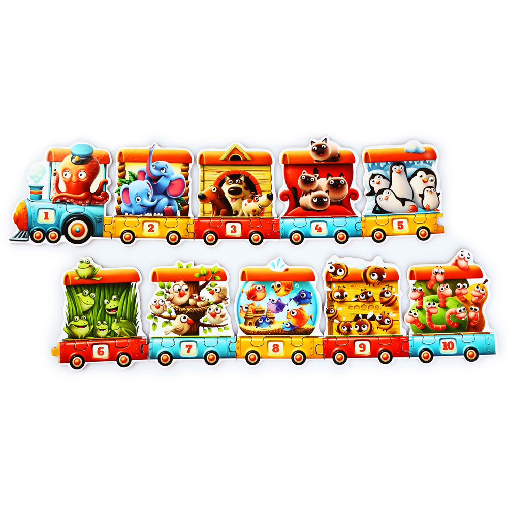 Ένα πολύχρωμο τρενάκι σας περιμένει να το ανακαλύψετε! Το εκπαιδευτικό παζλ περιέχει 20 πολύ μεγάλα κομμάτια, με τα οποία το παιδί σας μπορεί να δημιουργήσει 10 ξεχωριστές εικόνες από 2 κομμάτια την κάθε μία. Τα 10 τεμάχια έχουν αριθμούς. Ο σωστός συνδυασμός των αριθμών μπορεί να μας δώσει την λύση του παζλ! Αυτό το χαρακτηριστικό βοηθά τα παιδιά να γνωρίσουν τους αριθμούς και να προωθήσουν την ανάπτυξη της λογικής σκέψης. Το παζλ είναι κατασκευασμένα από ανθεκτικό, γυαλιστερό χαρτόνι.