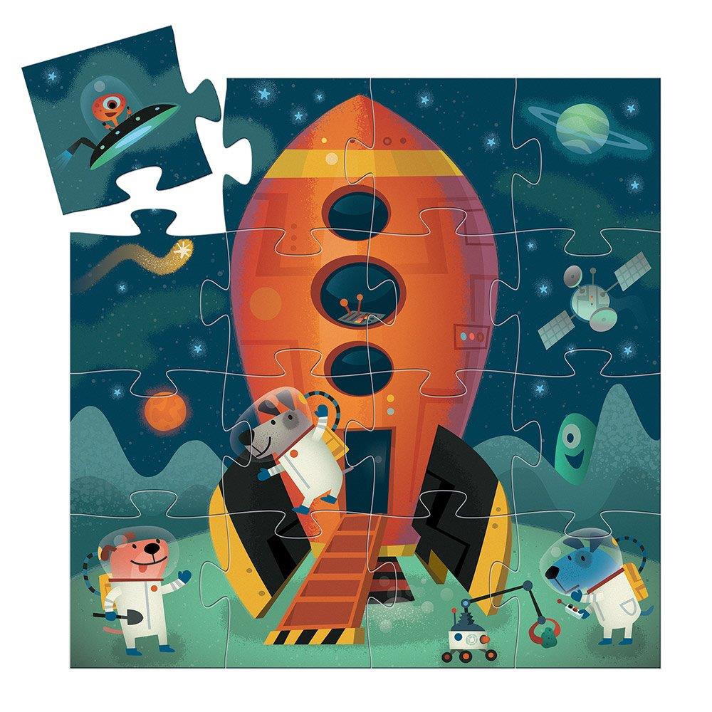 Ώρα να ξεκινήσει η διαστημική περιπέτεια! Μίνι παζλ σε σχηματικό κουτί, 16 τεμαχίων με θέμα το διάστημα, πρωτότυπα σχεδιασμένο από τον Bob Kolar για την εταιρεία Djeco. Ολοκληρώστε την εικόνα και θα δείτε τους τρεις φίλους να προσγειώνονται με το διαστημόπλοιο σε έναν μακρινό γαλαξία, απο τον οποίο μπορούν να δουν όλους τους πλανήτες και τα αστέρια από κοντά!
