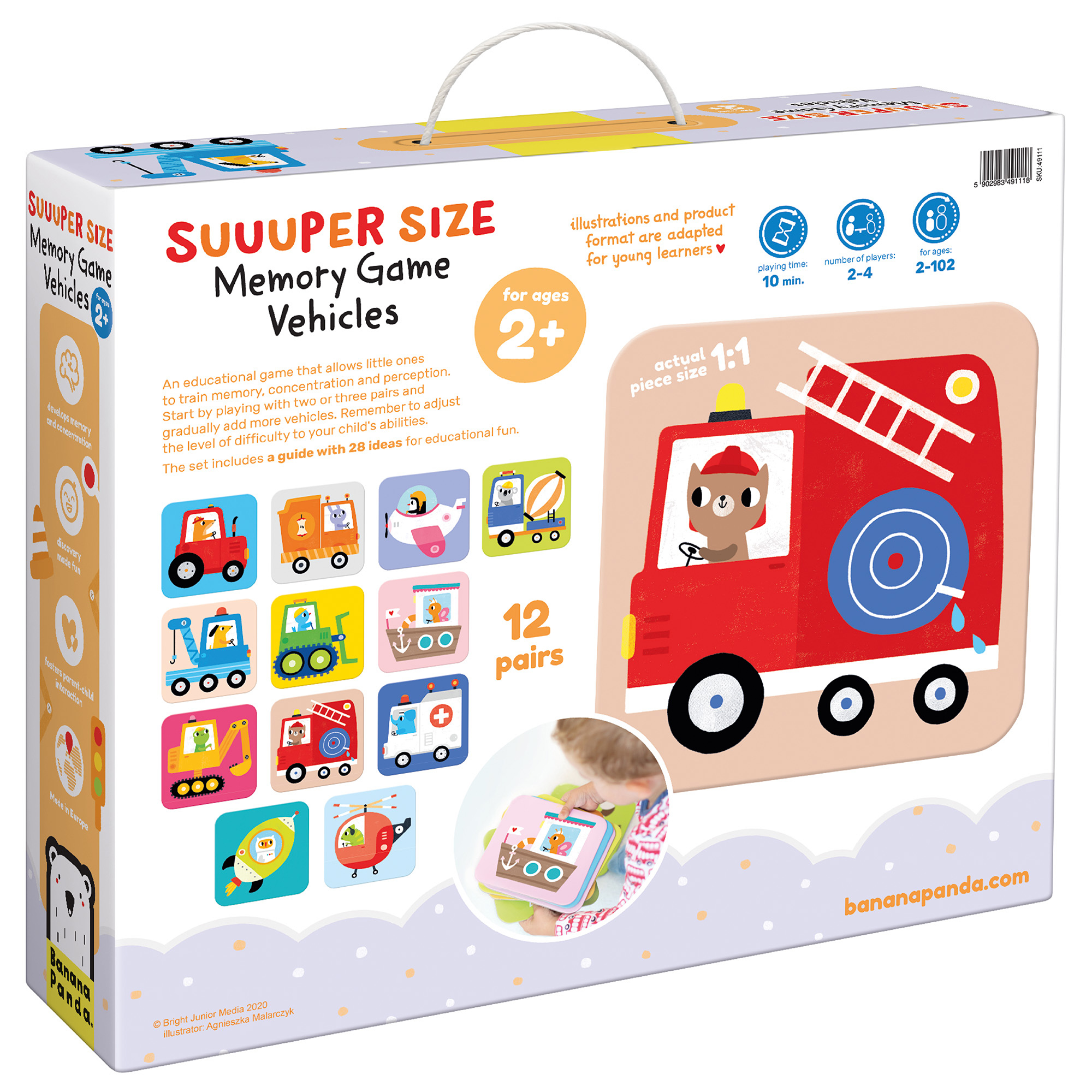 Πώς να παίξεις: Ξεκινήστε με 2 ή 3 ζευγάρια και στη συνέχεια προσθέστε άλλα οχήματα καθώς το παιδί σας γίνεται πιο ικανό. Απλώστε τα χαρτιά με την όψη προς τα κάτω. Ανακαλύψτε δύο κάρτες τη φορά. Αν είναι ίδια, αφήστε τα στην άκρη, αν όχι γυρίστε τα ξανά. Ο παίκτης με τα περισσότερα ζευγάρια κερδίζει. Μπορείτε επίσης να χρησιμοποιήσετε αυτά τα πολύ μεγάλα κομμάτια ως κάρτες flash για να μάθετε στο μωρό σας ονόματα των οχημάτων, τους ήχους ή τα χρώματα – σε οποιαδήποτε ηλικία. Απλά αφήστε τη φαντασία σας να οδηγήσει!