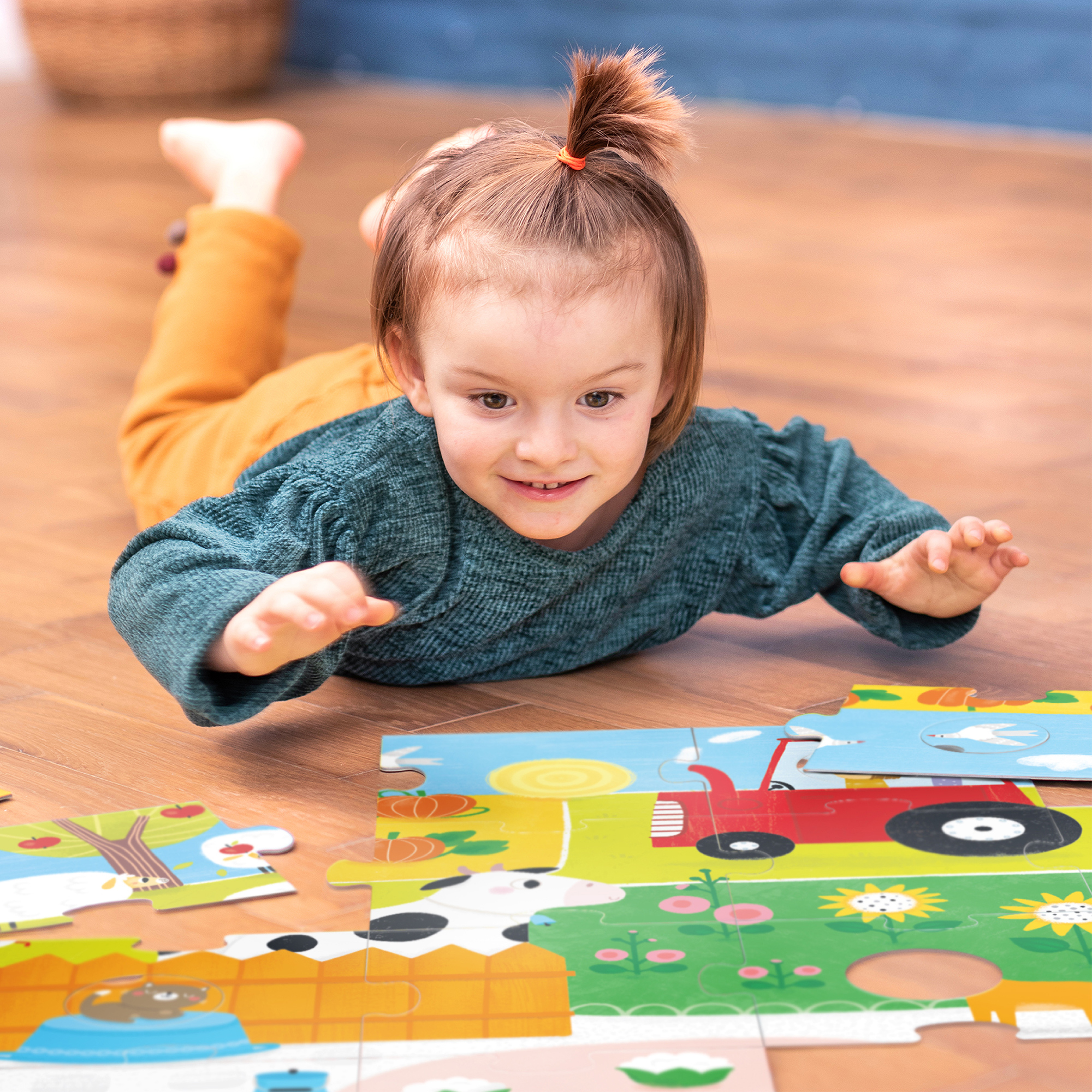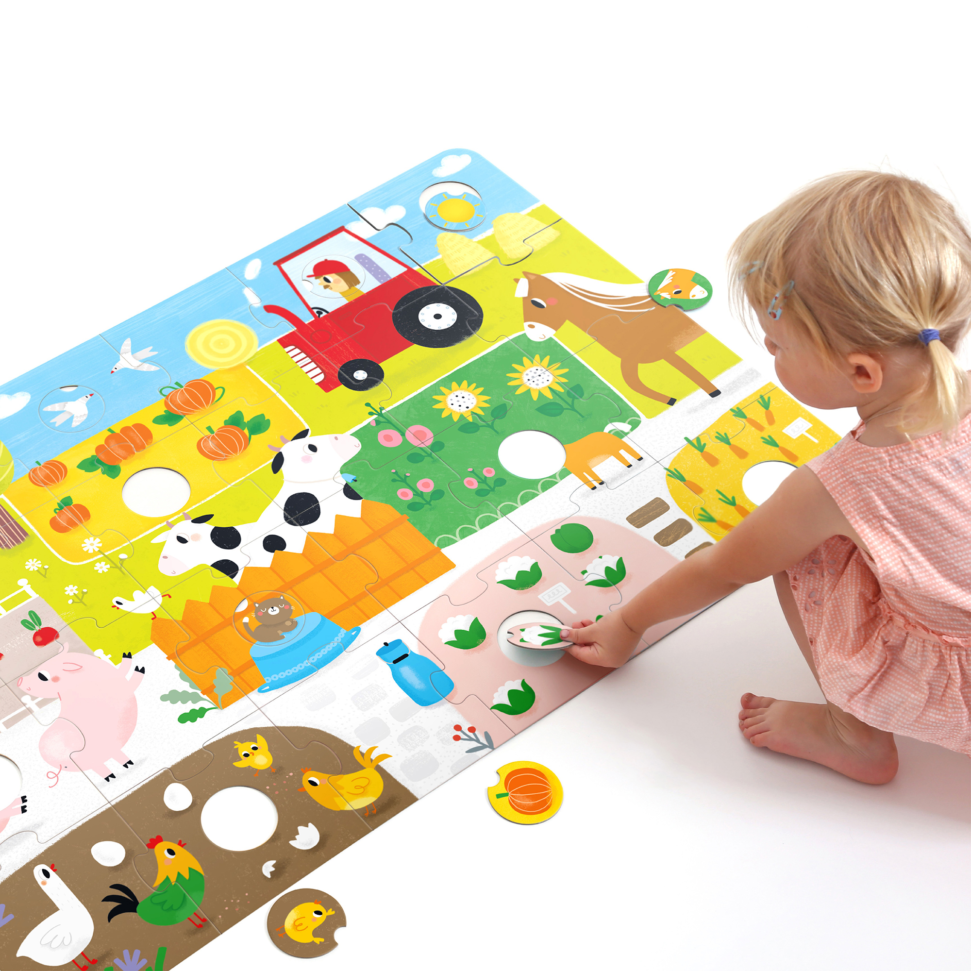 Αυτό το παζλ δαπέδου 34 τεμαχίων έχει όλα όσα αγαπούν τα νήπια: ένα χαρούμενο θέμα των ζώων φάρμας, μεγάλα και στιβαρά κομμάτια και στρογγυλά κομμάτια για ανάμειξη και αντιστοίχιση. Μπορείτε να ξεκινήσετε συναρμολογώντας τις μικρότερες σκηνές παζλ με διάφορα ζώα φάρμας και λαχανικά. Στη συνέχεια, συνδυάστε τα για να σχηματίσετε μια jumbo εικόνα και να ταιριάξετε τα στρογγυλά κομμάτια. Μπορείτε να αναμίξετε τα στρογγυλά κομμάτια για επιπλέον διασκέδαση και να τοποθετήσετε ζώα ή λαχανικά σε ασυνήθιστα μέρη