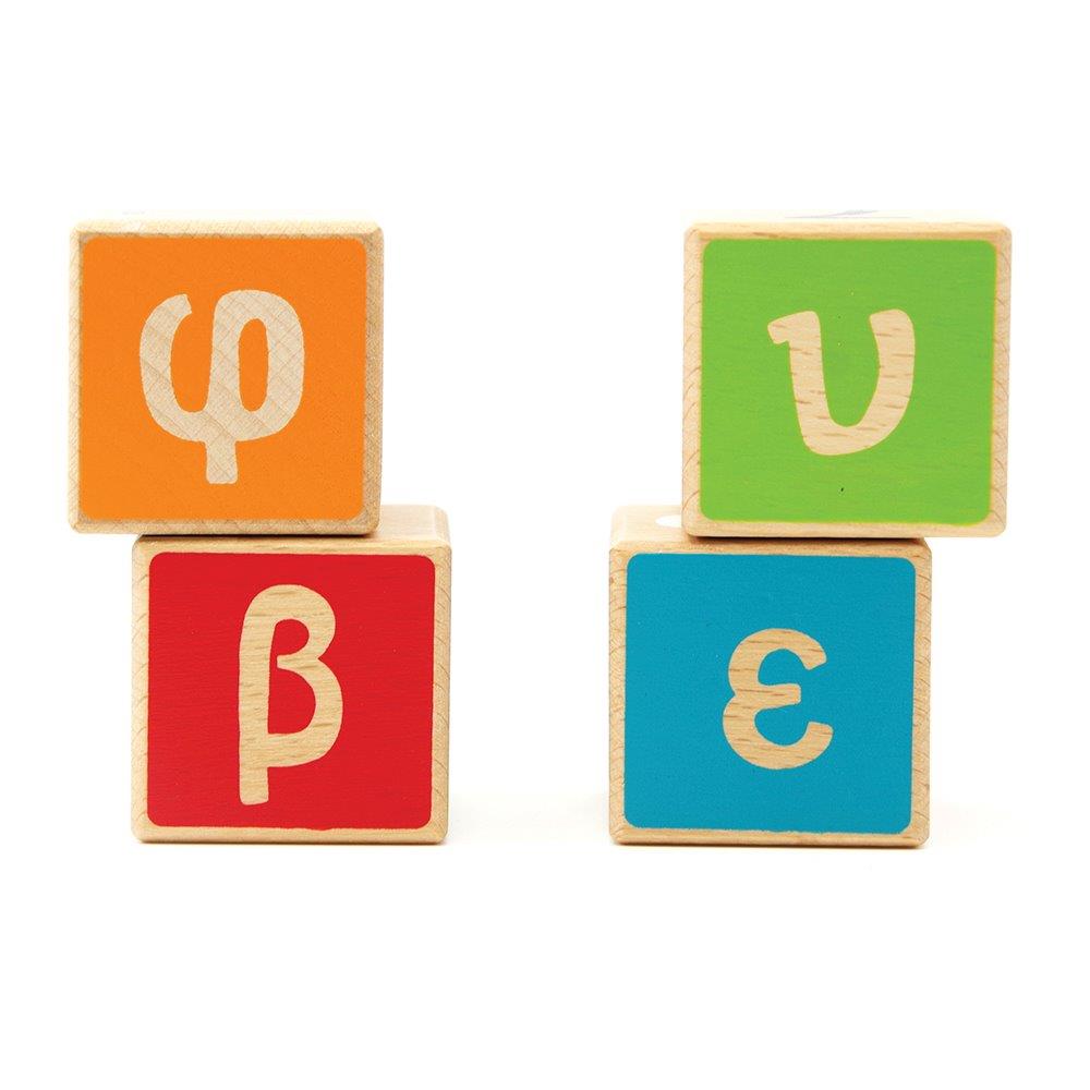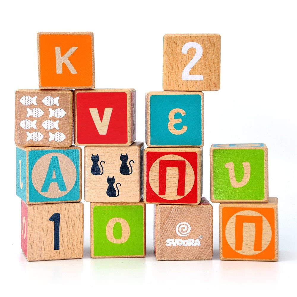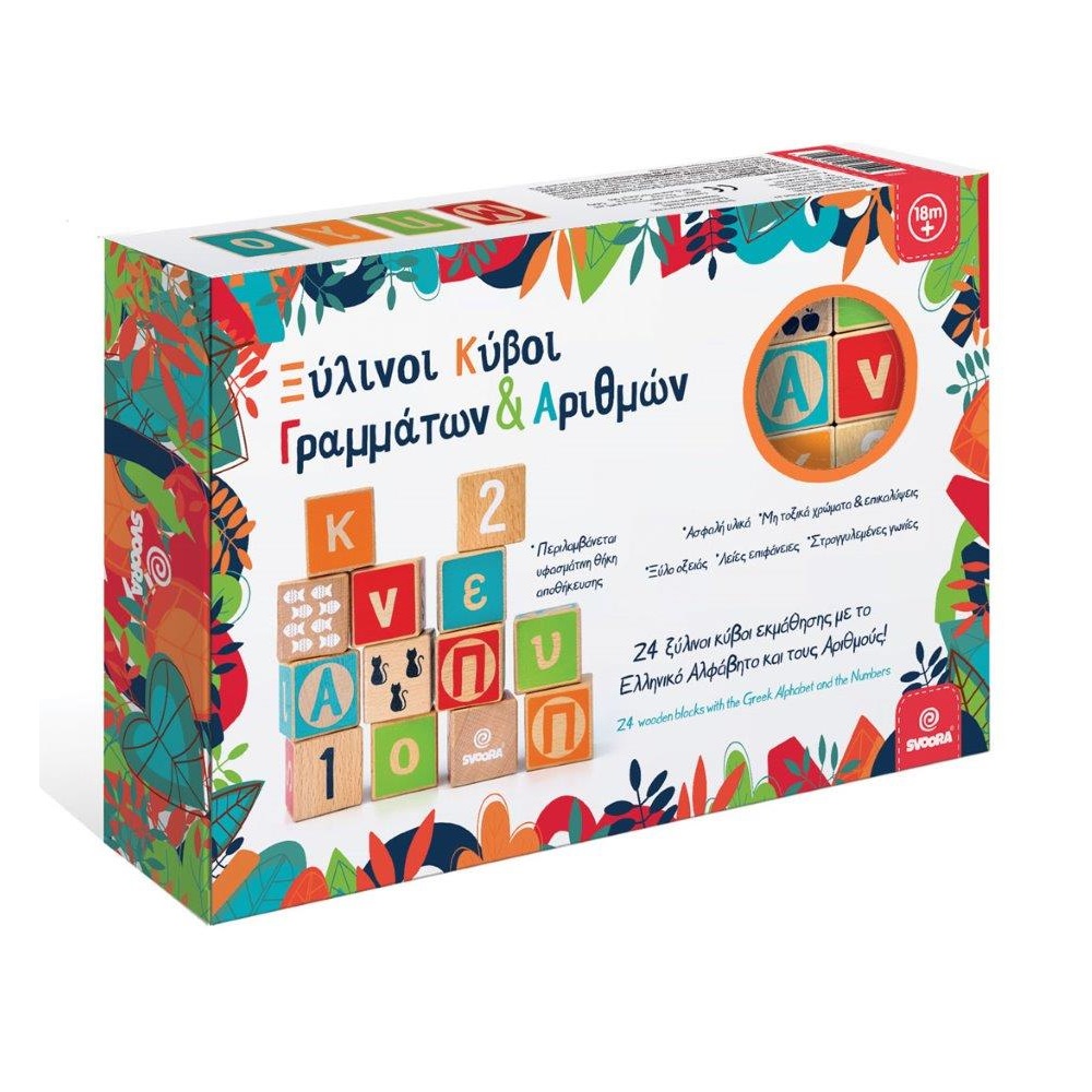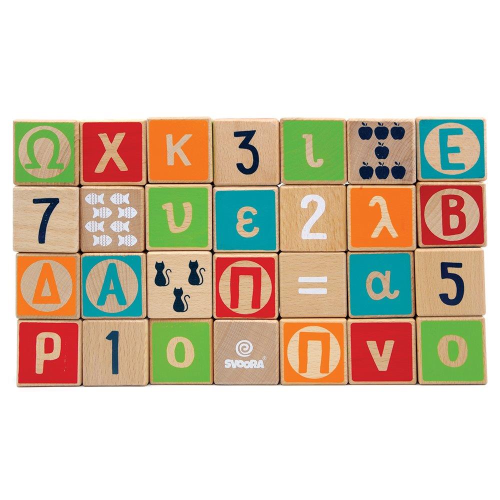 Ασφαλές εκπαιδευτικό παιχνίδι από την ελληνική εταιρεία Svoora, για την εξοικείωση με τα Ελληνικά γράμματα, τους αριθμούς και τις πράξεις. Περιλαμβάνει 24 τέλειους κύβους οξιάς με λεία επιφάνεια και στρογγυλεμένες γωνίες. Τυπωμένοι από τις 6 πλευρές τους, επιτυγχάνουν μέσα από το παιχνίδι στοίβαξης την: – Σχηματική διαφοροποίηση Κεφαλαίων και Πεζών γραμμάτων – Χρωματική διαφοροποίηση φωνηέντων και συμφώνων – Αντιστοίχιση πλήθους εικόνων με τον αντίστοιχο αριθμό – Χρωματική διαφοροποίηση μονών και ζυγών αριθμών Το πλήθος ανά γράμμα της αλφάβητου έχει μελετηθεί ώστε να δίνει τον μέγιστο αριθμό λέξεων. Οι 24 ξύλινοι κύβοι είναι και ένα κλασικό παιχνίδι όταν χρησιμοποιούνται σαν τουβλάκια στοίβαξης με ποικίλους δημιουργικούς τρόπους για ατέλειωτες ώρες παιχνιδιού! Στη συσκευασία περιλαμβάνεται πρακτική υφασμάτινη θήκη αποθήκευσης.