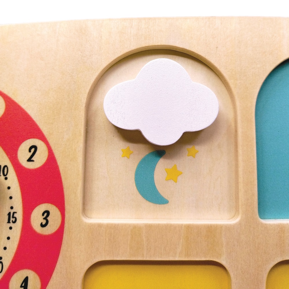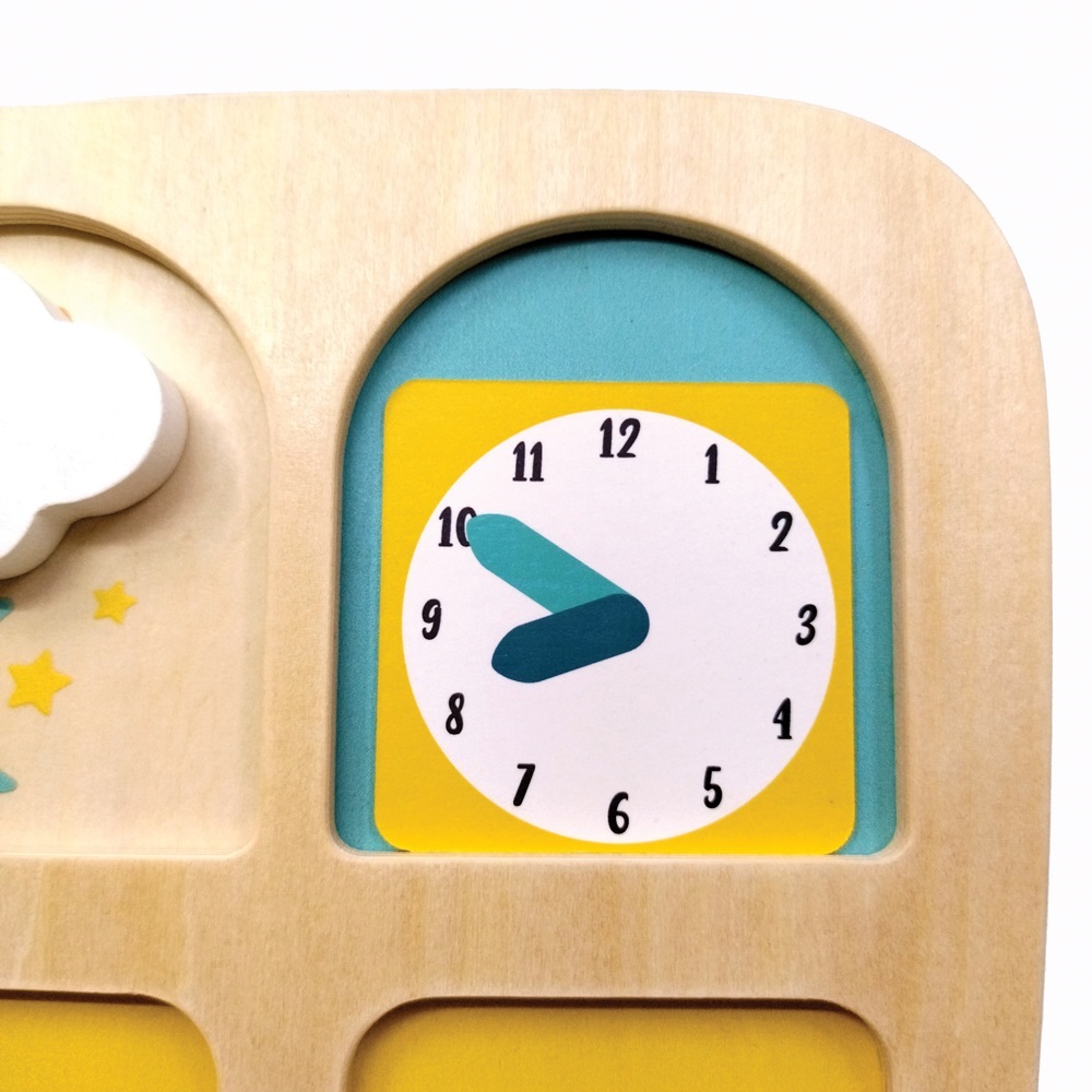 Ξύλινο εκπαιδευτικό παιχνίδι ‘Μαθαίνω την Ώρα’ από την ελληνική εταιρεία Svoora. Ενθαρρύνει τα παιδιά στην πρώτη επαφή τους με την ώρα και τις έννοιες της με ευφάνταστο, εύκολο και δημιουργικό τρόπο. Η αναλογική μορφή με τους δύο δείκτες και η ψηφιακή μορφή με τα 15 πλακίδια αριθμών εκπαιδεύουν τα παιδιά στην ανάγνωση του ρολογιού, ώστε να δίνουν σωστές απαντήσεις στη δημοφιλή ερώτηση ‘Τι ώρα είναι’. Το περιστρεφόμενο συννεφάκι τα εξοικειώνει με τις έννοιες της προ- και μετά- μεσημβρίας. Οι 24 κάρτες που περιέχονται στη συσκευασία, παρουσιάζουν διάφορες ώρες και με τις δύο μορφές τους, ενώ οι διαφορετικοί χρωματισμοί τους αντιστοιχούν στα 4 τμήματα της ημέρας: το πρωί, το μεσημέρι, το απόγευμα και το βράδυ. Το παιχνίδι είναι κατασκευασμένο αποκλειστικά από ξύλο οξιάς και κόντρα-πλακέ, χωρίς αιχμηρά σημεία και με λείες επιφάνειες για απόλυτα ασφαλή χρήση. Τα ζωηρά του χρώματα είναι μη τοξικά και σε συνδυασμό με τα χαρούμενα μοτίβα, εξάπτουν τη φαντασία! Περιέχει 2 ξύλινα κομμάτια στήριξης για παίξιμο στο γραφείο ή το τραπέζι, μία επεξηγηματική κάρτα με όλους τους πιθανούς συνδυασμούς ημέρας και ώρας, βαμβακερή θήκη αποθήκευσης.
