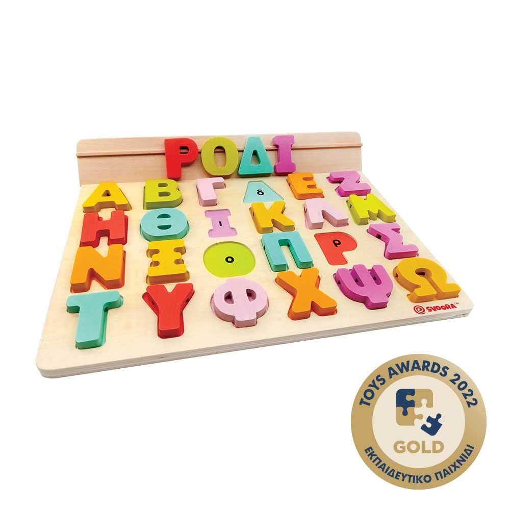 Ελληνικό αλφάβητο σε ξύλινη βάση. Η Ελληνική εταιρεία Svoora δημιούργησε ένα ασφαλές παιχνίδι, με το οποίο τα παιδιά μπορούν εύκολα να αντιληφθούν τα 24 γράμματα της ελληνικής αλφαβήτου! Η διαδικασία της μάθησης γίνεται πιο διασκεδαστική, καθώς το παιχνίδι περιλαμβάνει 50 κάρτες πρώτης γραφής και ανάγνωσης, έτσι ώστε η ταύτιση της εικόνας με το κάθε γράμμα να βοηθήσει στην κατανόησή τους. Το παιχνίδι προετοιμάζει τα παιδιά για την ομαλή ένταξή τους στο δημοτικό με δημιουργικό τρόπο! Περιλαμβάνεται 1 ξύλινη βάση (2 τεμαχίων), 24 γράμματα κατασκευασμένα από μασίφ ξύλο οξιάς και 50 κάρτες πρώτης γραφής. Τα γράμματα έχουν ύψος 5.1 εκατοστά και πάχος 1.2 εκατοστά.